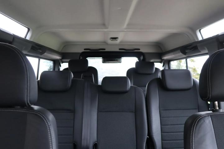 This Defender has a beautiful and rugged appearance, finished in all black. The deep black colour has a beautiful shine and the visual condition is very good with only minimal signs of wear. The 15-inch alloy wheels are in top condition. Running boards on the sides give the car an extra robust look. At the rear, there is a step for the rear passengers, a tow bar and a spare wheel. The lights and rubbers are in good condition.