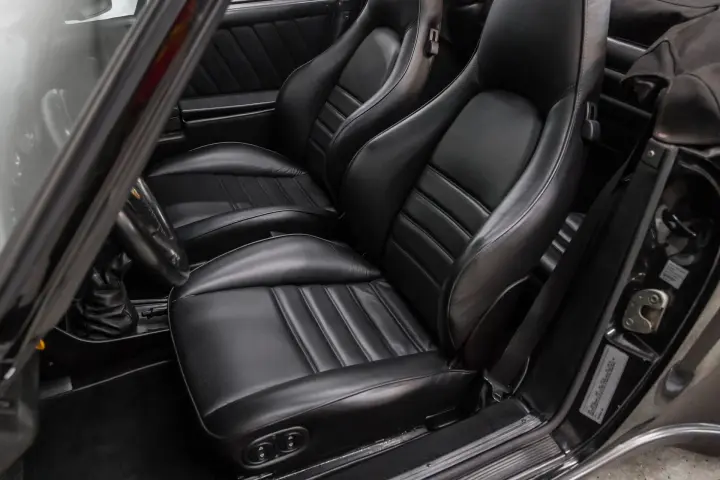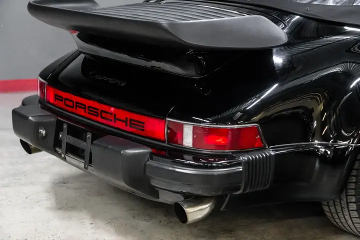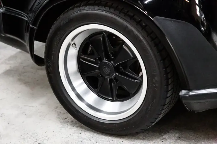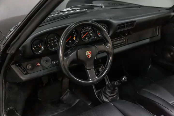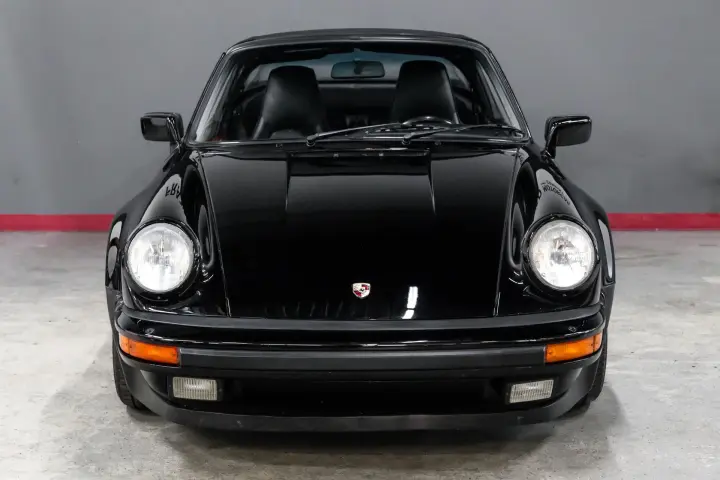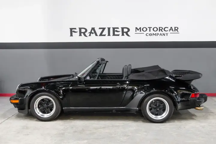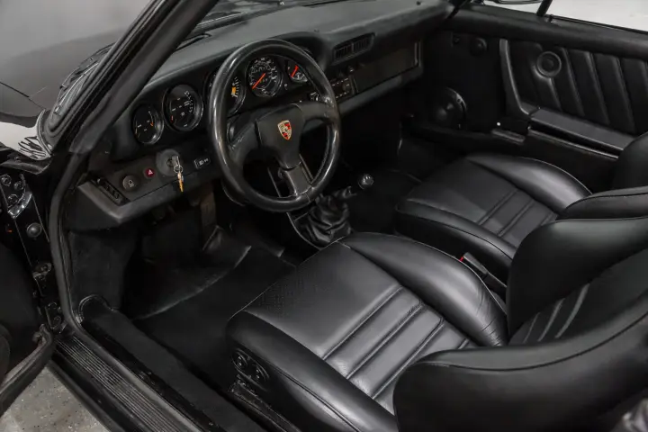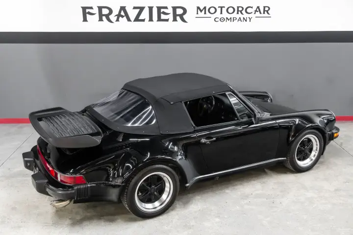 This black-on-black 1985 Porsche 911 Carrera cabriolet was optioned with the M491 “Turbo Look” package, which added front and rear spoilers as well as wider rear bodywork. Powered by a 3.2-liter flat-six paired with a 915 five-speed manual transaxle, the car is equipped with a limited-slip differential, 16″ Fuchs-style wheels, power-adjustable sport seats, cruise control, and air conditioning, and has been fitted with Bilstein dampers, a Bluetooth-capable Continental head unit, and an aftermarket exhaust system
