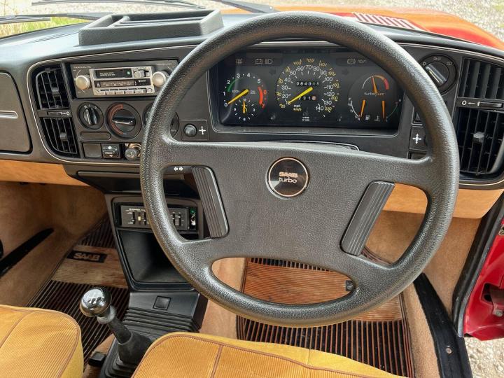The exterior is in overall excellent condition for the age, with straight panels and no heavy damage. There some stone chips, a few very small blisters here and there, and signs of minor paint repairs over the years but all to a good standard and overall the attractive Cherry Red paint presents well with a deep shine. All the bumpers and trims again appear to be original and in great order. The original Saab minilight style alloy wheels are tidy and shod with nearly new Goodyear all weather tyres. There is a tow bar which would suit a small trailer or bike rack , or I can have this removed if you prefer. I quite like it to be honest and I think it look appropriate! The car was still sporting it's original dealer tax disc holder, window sticker and number plates. The number plates were getting to be in poor condition, so I have commissioned and fitted a beautiful pair of exact replica dealer plates from Retro Plates, they look fabulous and I have retained the old ones for provenance.