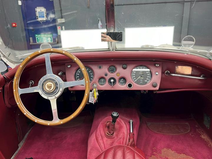 Finished in contrasting Maroon the interior, like the exterior, has a lovely lived in patina about it. The mats are a little threadbare in places but all the leather is lovely condition. The dash houses a set of fully functioning gauges and is topped off by that beautiful Moto-Lita steering wheel.