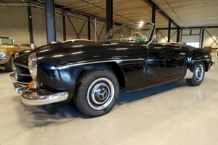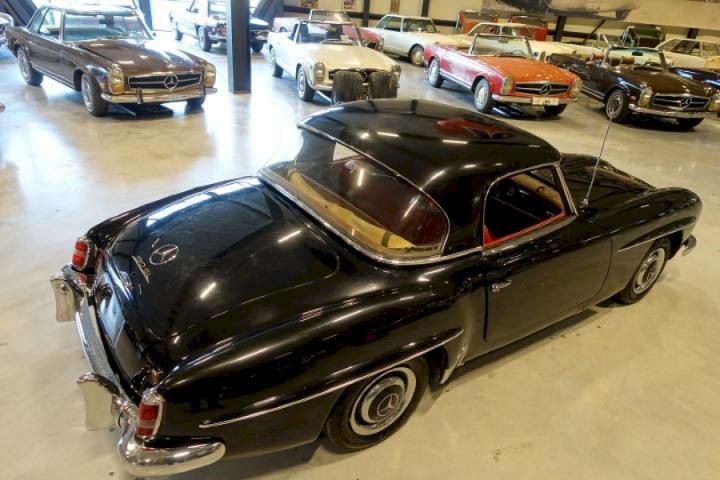 This is a Matching Number 190SL, this specific convertible hit the roads in 1962 and left the factory in the colour black 040 with an red interior, it comes with European bumpers, a black Hardtop and Soft-top.