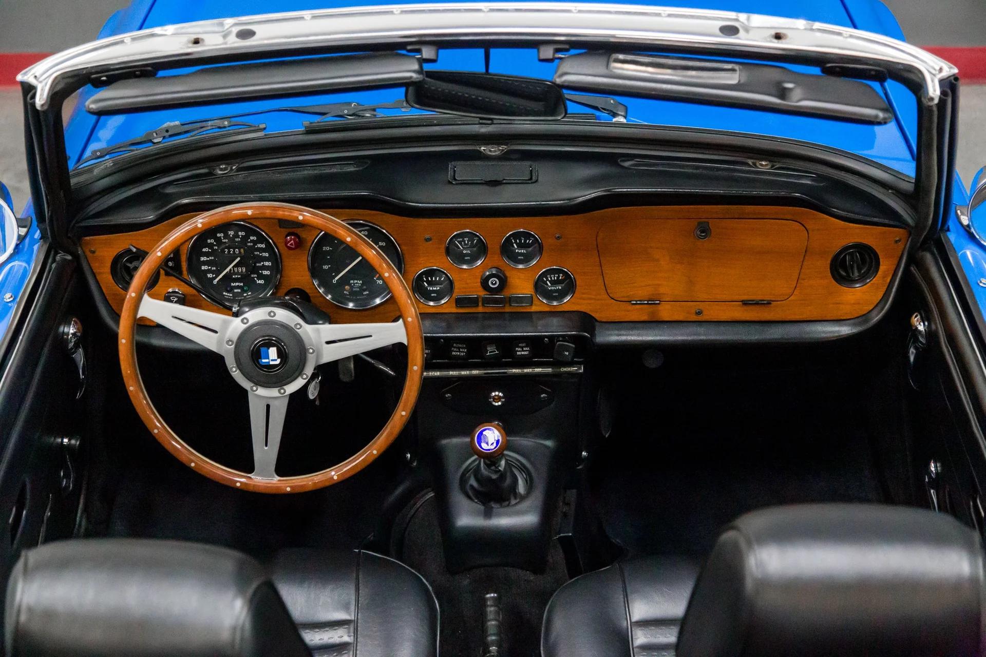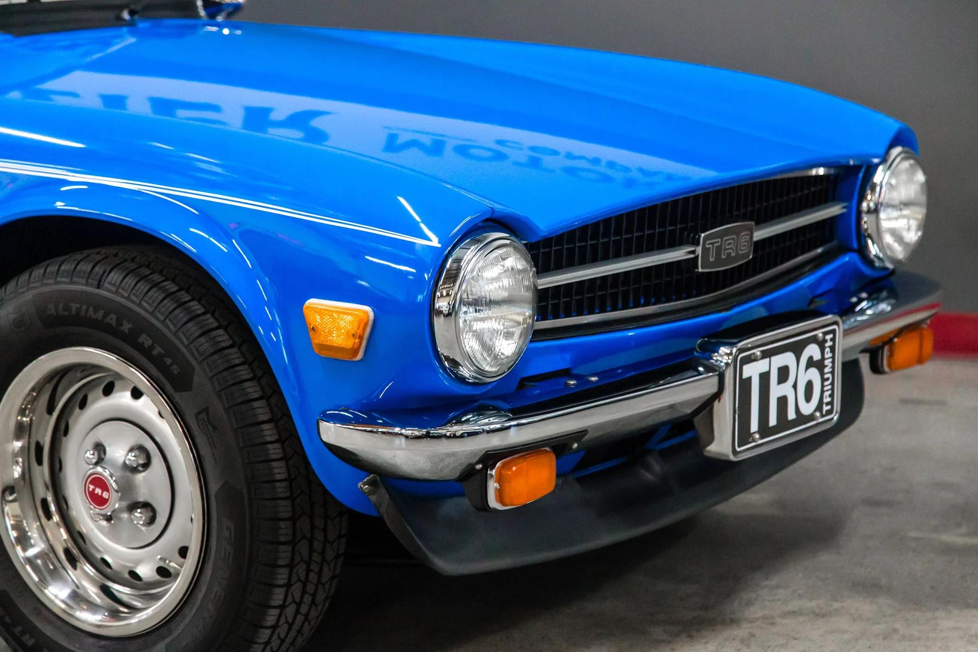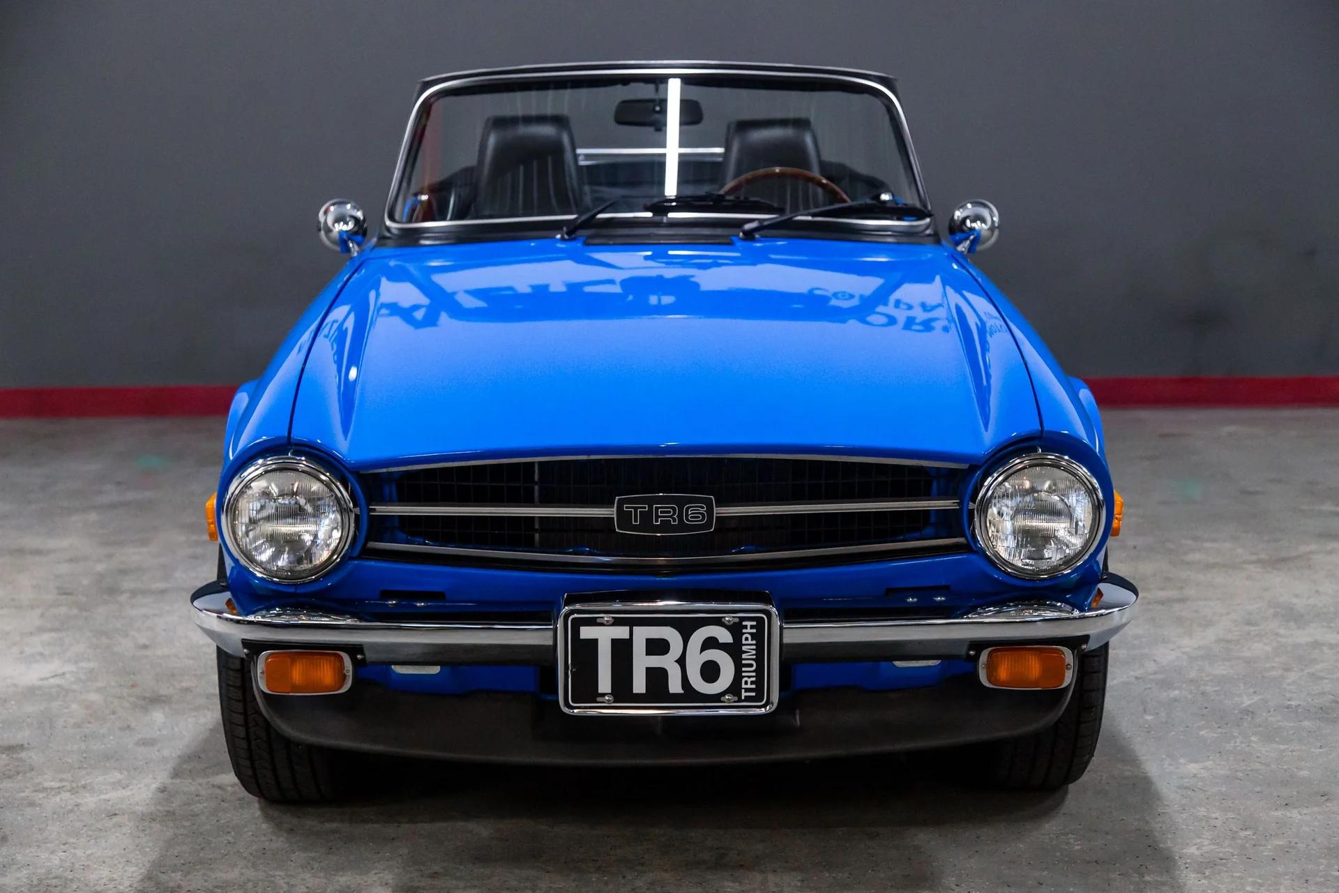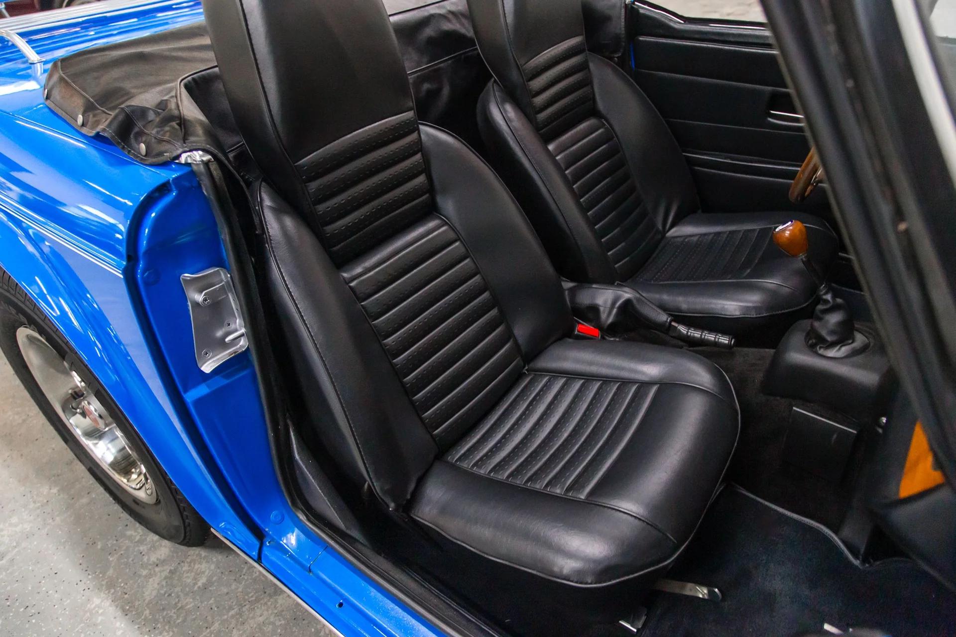This extraordinary condition TR6 has a lot to brag about. The color is a true TR6 color paint code 146-Tahiti Blue. The bumper overriders have been removed and 1969 Triumph TR6 seats have been installed .The result is some of the attractive characteristics of an early car married to the mature line of a 1976 car.