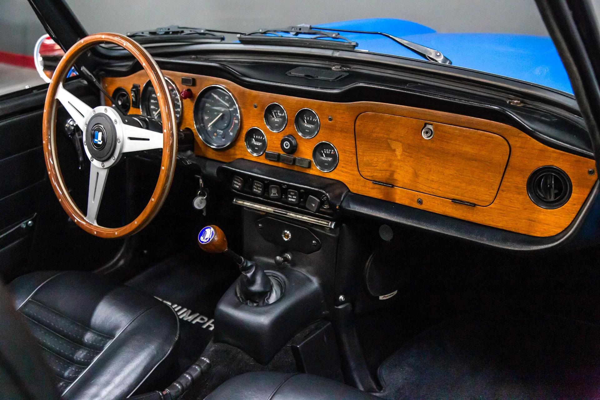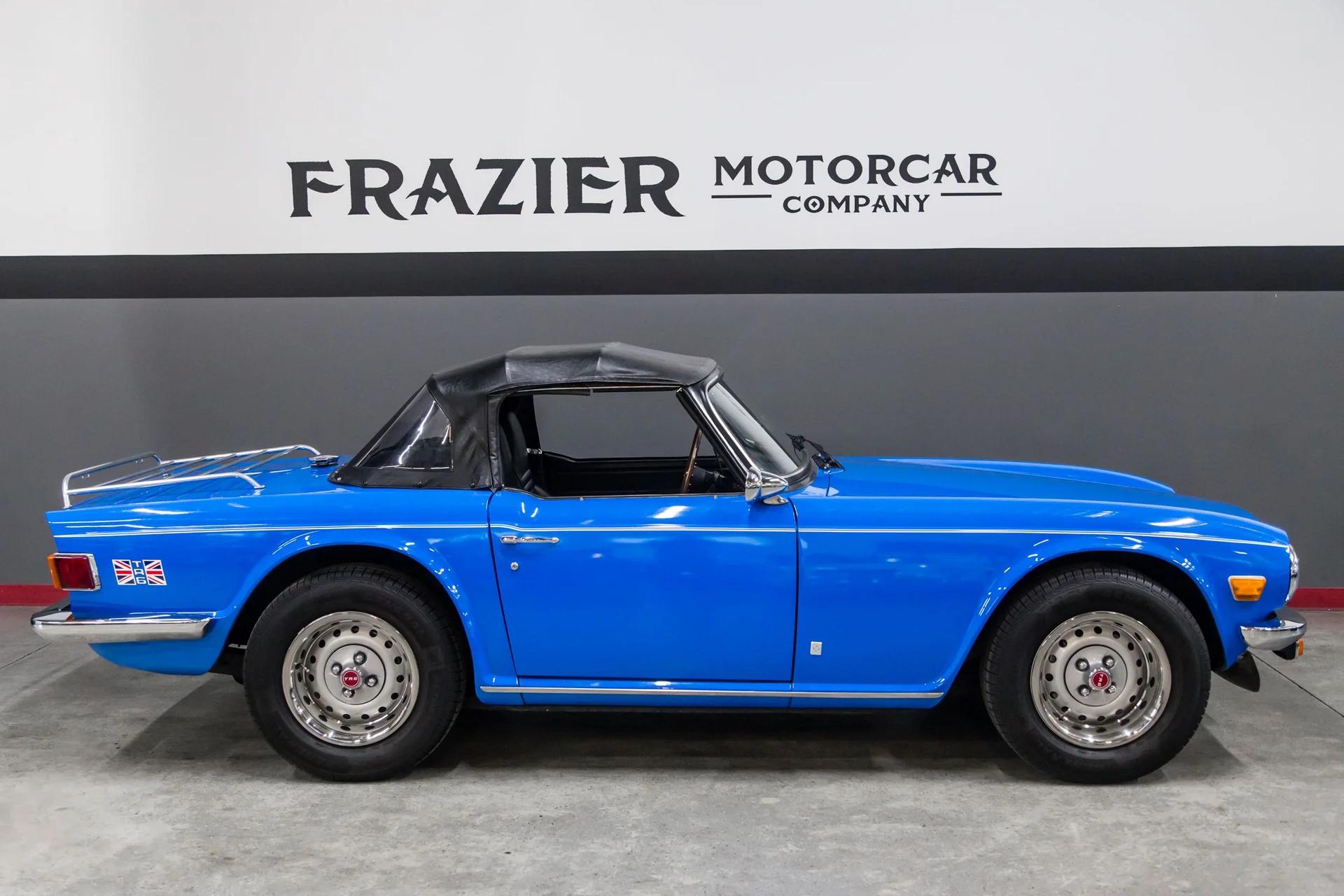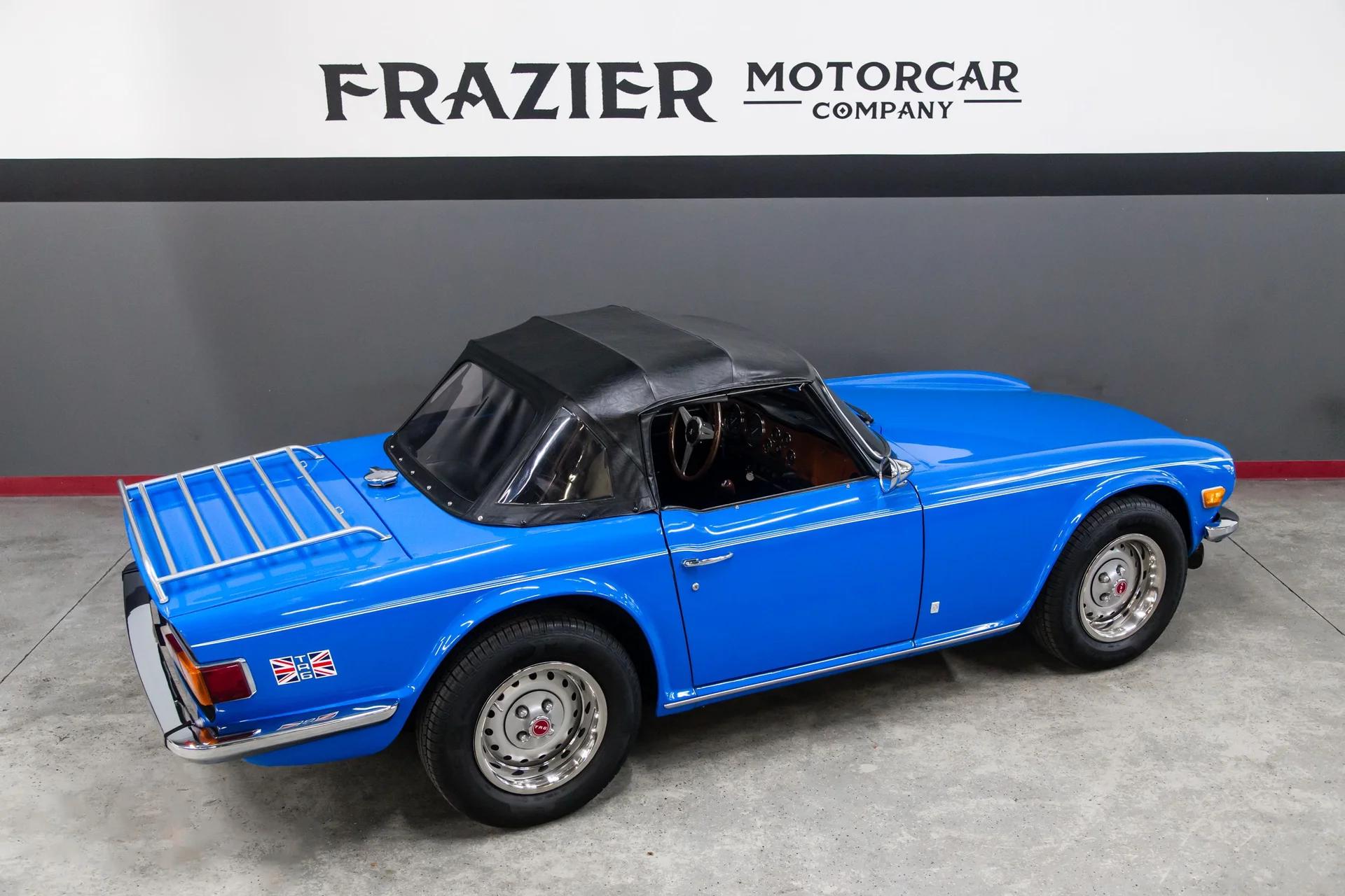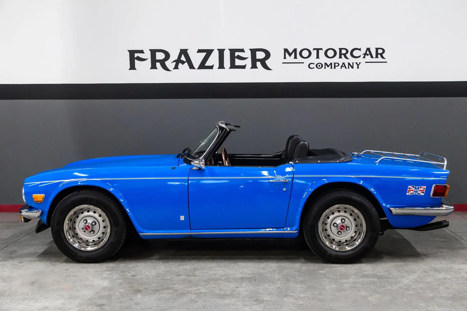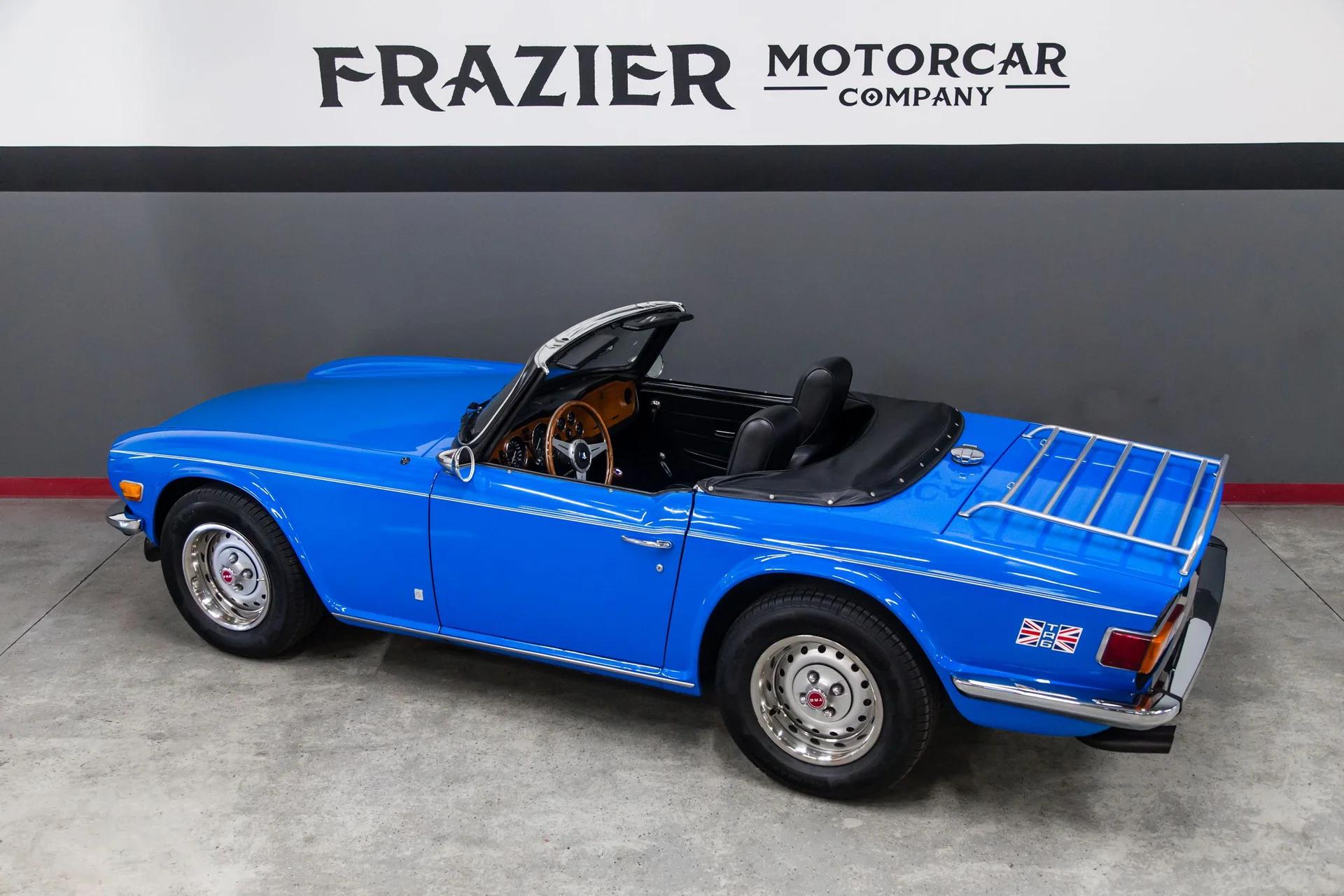 This extraordinary condition TR6 has a lot to brag about. The color is a true TR6 color paint code 146-Tahiti Blue. The bumper overriders have been removed and 1969 Triumph TR6 seats have been installed .The result is some of the attractive characteristics of an early car married to the mature line of a 1976 car.