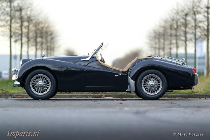 Kleur donkerblauw met een beige leren interieur. Beige ‘soft-top’ en zwarte ‘side-screens’. Deze fraaie Triumph TR 3a verkeert in zeer goede staat! De beige vloerbedekking toont duidelijke gebruikssporen.