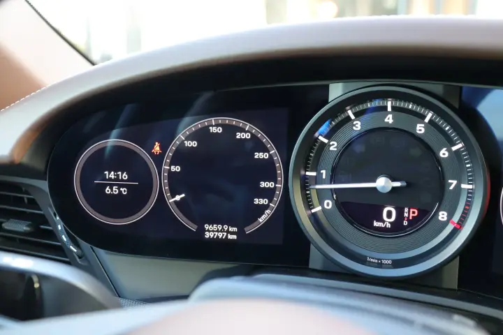 This 911 is beautifully configured, as evidenced by the chosen rims. These Carrera Exclusive Design wheels (€2,542 extra charge) are still in good condition. Red brake calipers are visible behind the rims. The exterior is in good condition. A popular option on this car is the LED matrix headlights including PDLS Plus (€3,066): these incredibly bright beams are automatically controlled and adjusted for oncoming traffic.