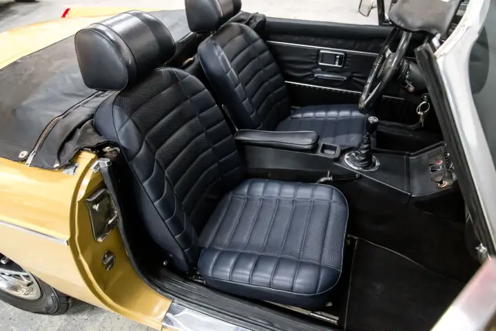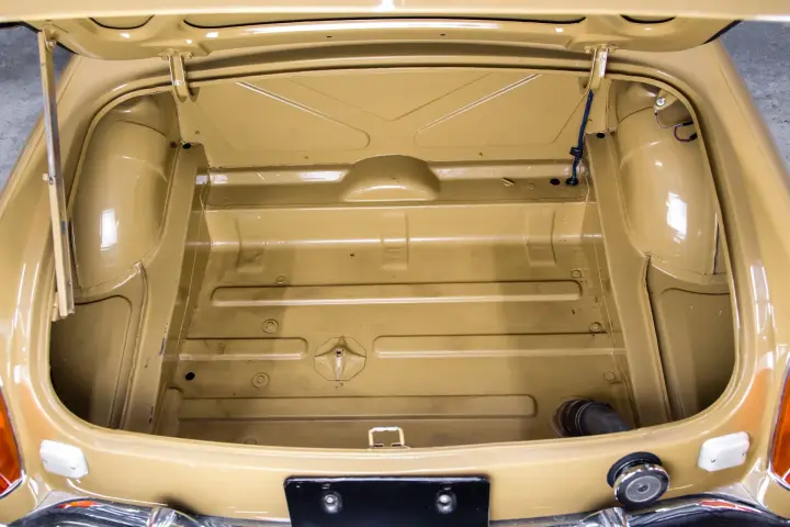 This car is tight in the suspension, with a quiet transmission, and smooth overdrive. Brakes are in good order ,the tires are deep in tread. The instrumentation gauges are clean ,crisp ,and work as designed .All electrical are in good working order .Chrome and bright work is in excellent condition .Seats sit full and in good condition, carpets are good, door cards are straight, soft top is in good condition.
