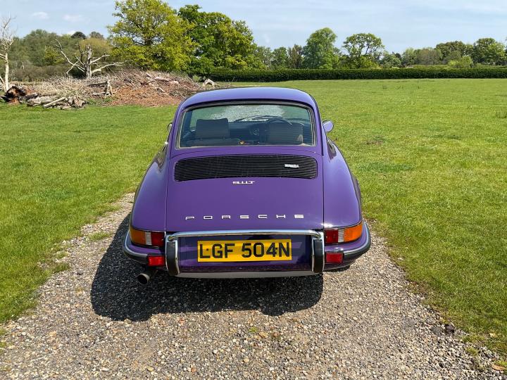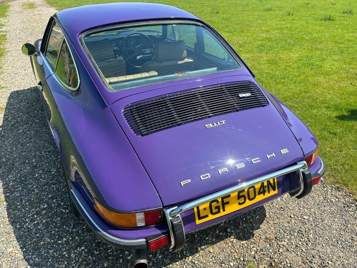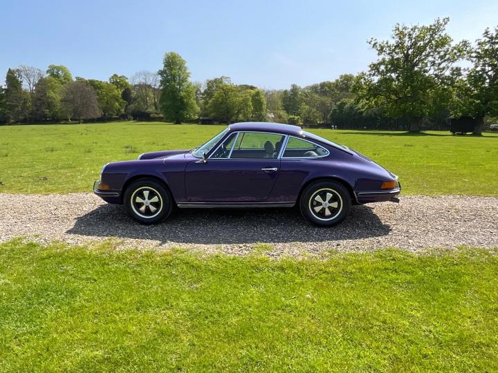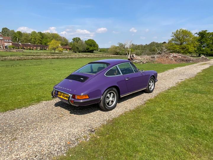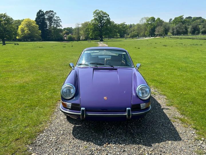 1973 Porsche 911 T 2.4. Showing 99,000 miles, this 911T has just come from long ownership having been in the previous owners hands for the last 26 years, with just 5 former keepers registered. This car is finished in 341 Royal Purple which is believed to be the original colour with original 15" Fuchs forged alloy wheels which are in the classic black backed colourway, tan and black interior and the classic 5 dial Porsche setup dashboard. It has lots of originality, including the original service book stamped from authorised Porsche dealer "Motortune Ltd" in Brompton, London, in 1975. It is believed that the car remained with a dealer before getting its first registration 2 years later. In 2019, the car underwent a bodywork restoration with a fresh respray and any welding needed was done. All the body panels align well and there is no visible distortion to any areas. Overall the bodywork is in good solid condition. The underside is stunning as shown in the images. In 2022, a major service was carried out including a new clutch, brakes refreshed all round, new calipers all round, the engine seals replaced alongside some of the oil lines as necessary. The carpets were replaced along with new front and rear windscreens. The mechanicals on this porsche are superb. The car drives great and no expense has been spared when it has come to servicing this car. There is a huge amount of history contains old tax discs, original service book, old MOTs, reciepts, photographs from the restoration and more. This 911 will always put a smile on your face once you’re behind the wheel, and it will always turn heads.