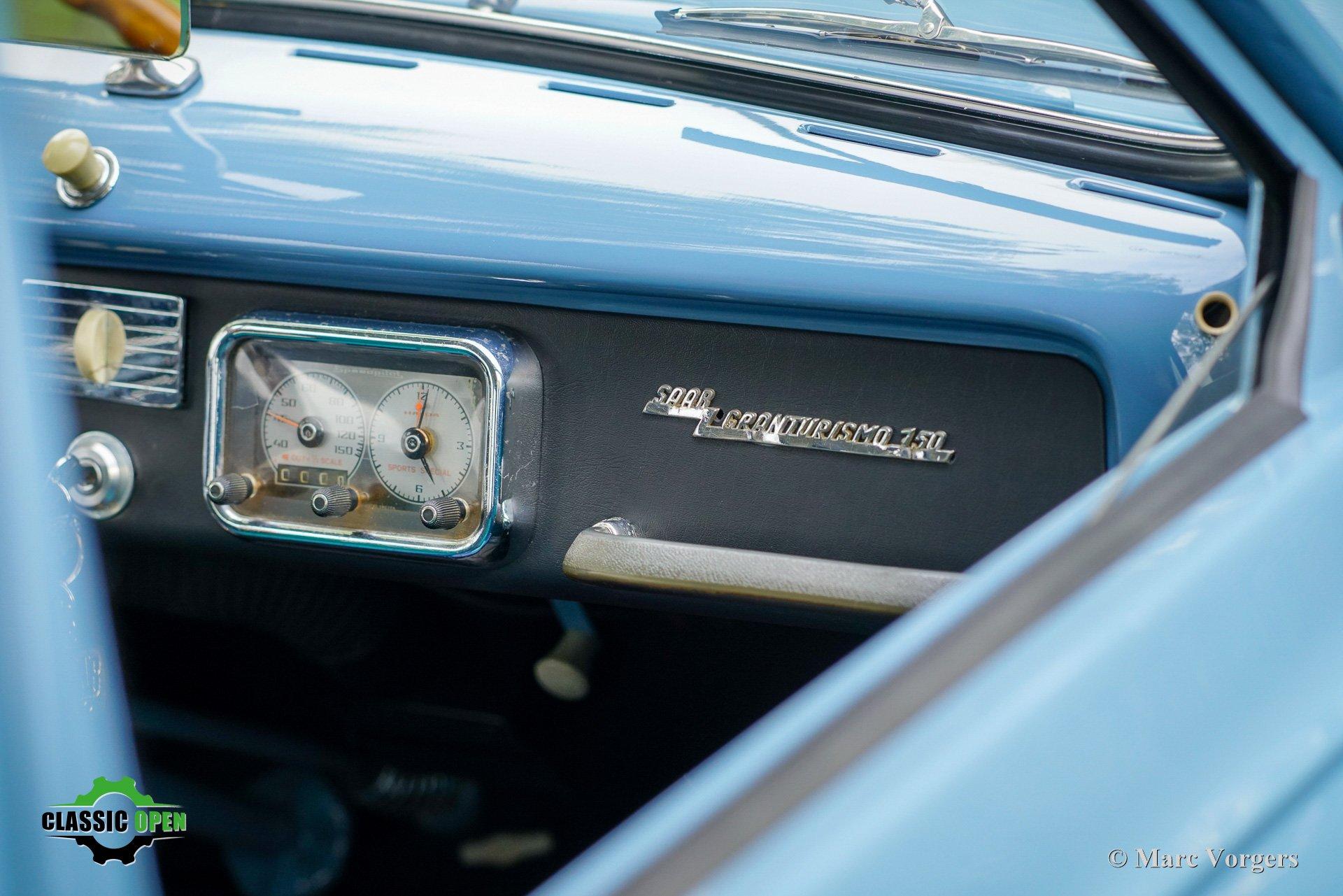 Carrosserie in blauw gecombineerd met een blauwgroen vinyl/stoffen interieur afgewerkt met zilveren biezen.