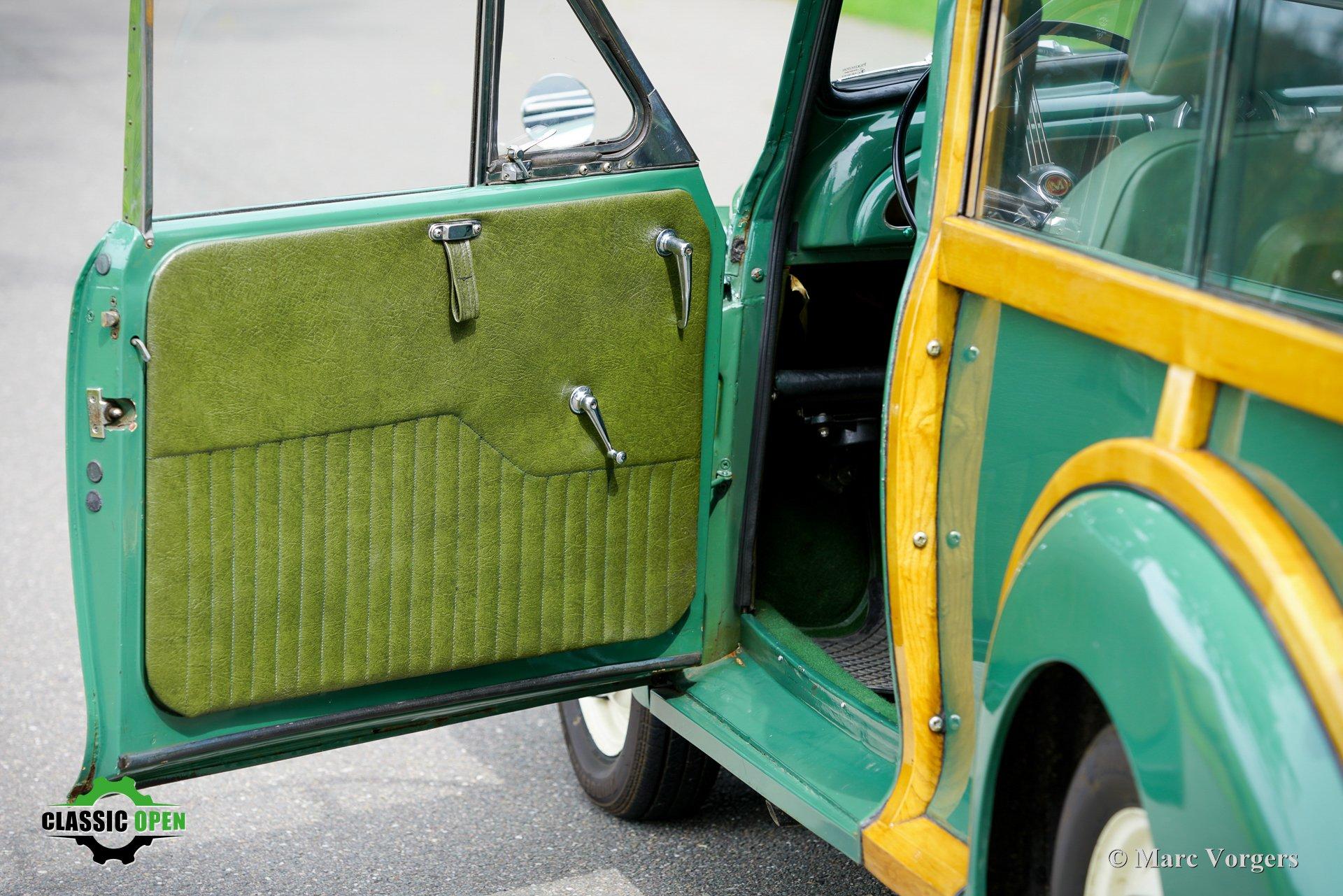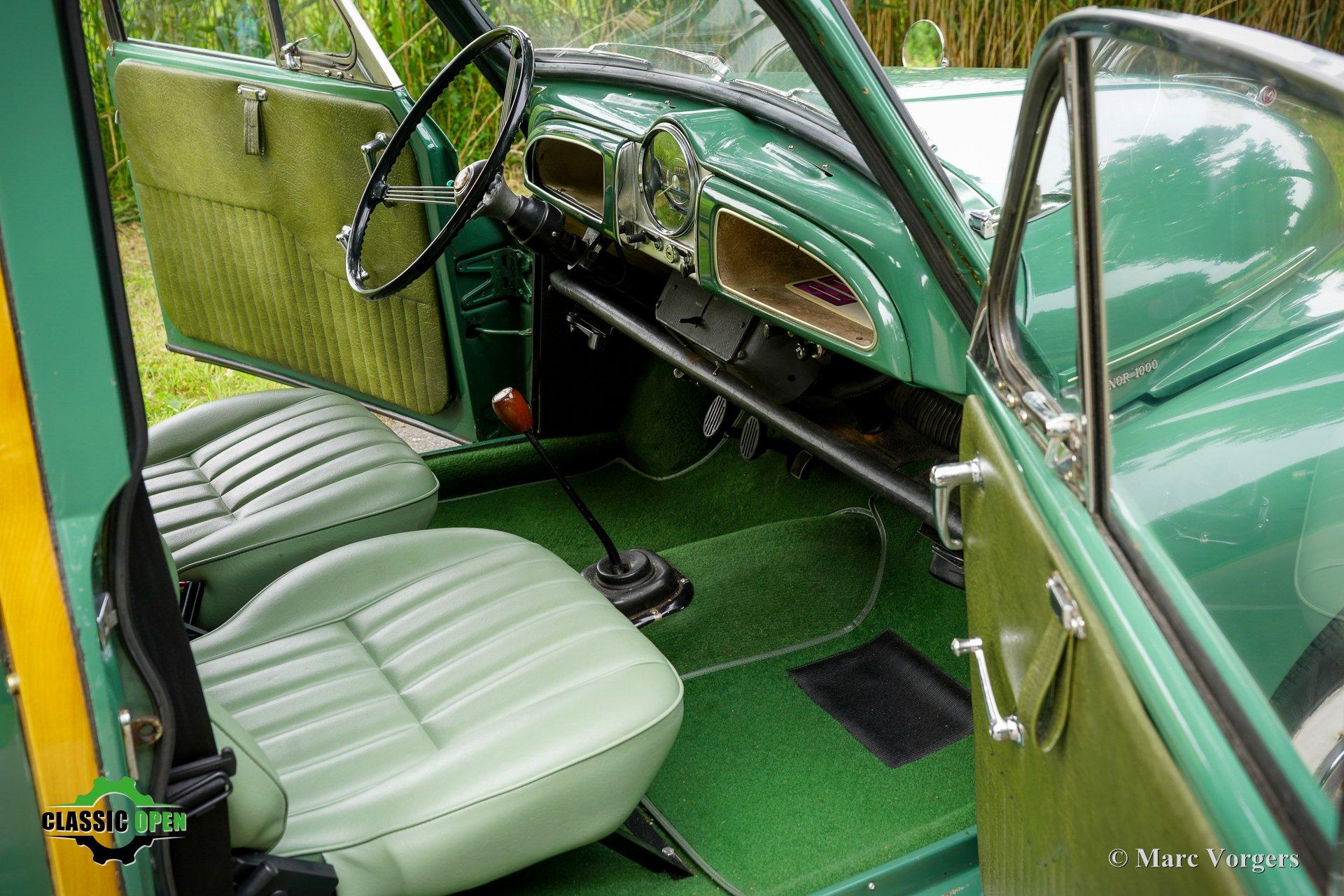 Deze prachtige Morris Minor Traveller uitgevoerd in Almond Green met een bijpassend groen interieur, werd in 2001 geïmporteerd uit Engeland en is sindsdien zorgvuldig onderhouden in Nederland.