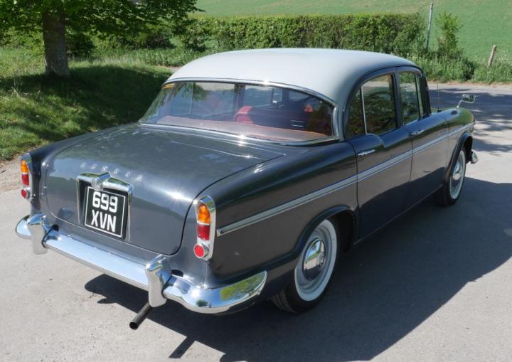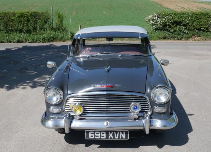 A solid example well presented in two-tone dark grey with light grey coachline and roof, very good red leather interior. Recent service and general overhaul including ignition system, brakes, clutch, Dynator, 5 new tyres, battery, rear shock absorbers etc. and including a new MOT, only 3 owners and possible low mileage. Drives well with 4 speed column gearchange and good brakes (discs on the front). Comes with sun visor, a Rootes Workshop Manual, Lubrication Chart, magazines and some history.