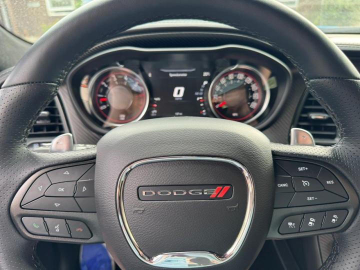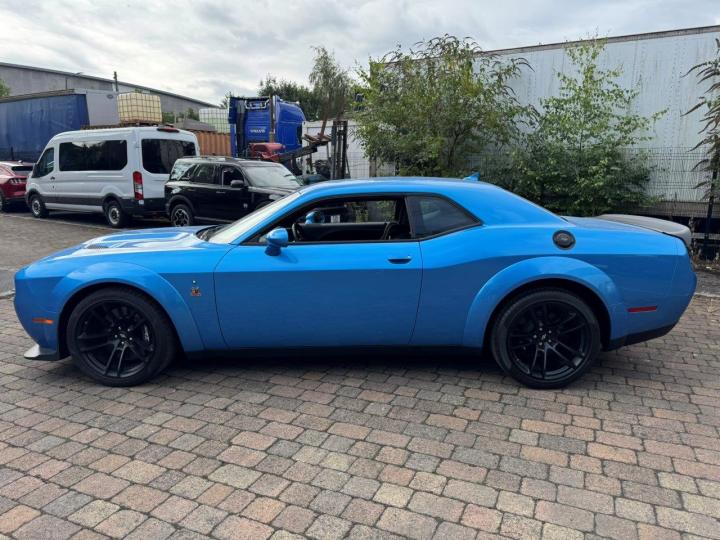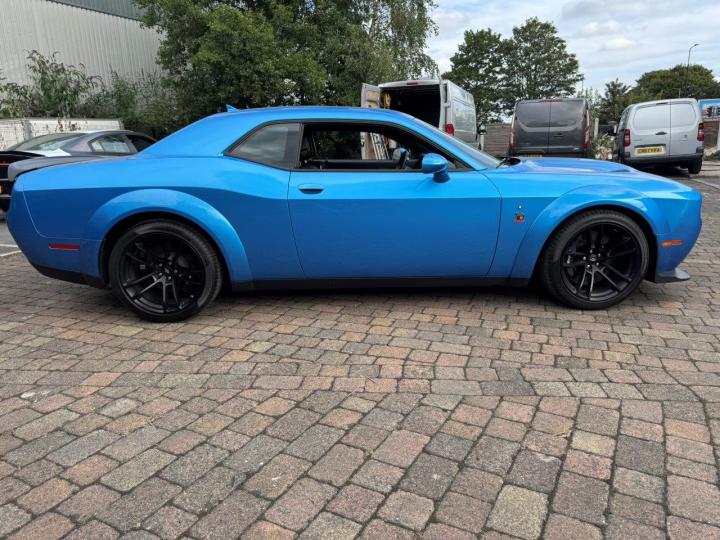 UK registered, delivery mileage 25-plate Dodge Challenger 392 HEMI V8 (6.4L) Scat Pack Widebody with PLUS Package, 485hp, 8-Speed ZF Automatic in B5 Blue Pearlcoat with Black Alcantara Performance Interior with SCAT PACK Logo, Black Suede Headliner, Uconnect 8.4inch inc. CarPlay & Android, 4Gwifi, Climate & Adaptive Cruise, LSD, Launch control, Rhombi Illuminated Inner Headlights, Brembo Brakes, Performance suspension, Performance Active Exhaust System, Performance Apps, Heated & Vented Seats, El Drivers Seat with Memory, Rear Camera, An amazing opportunity to own to own a genuine US Muscle car at the end of this iconic second muscle car era!