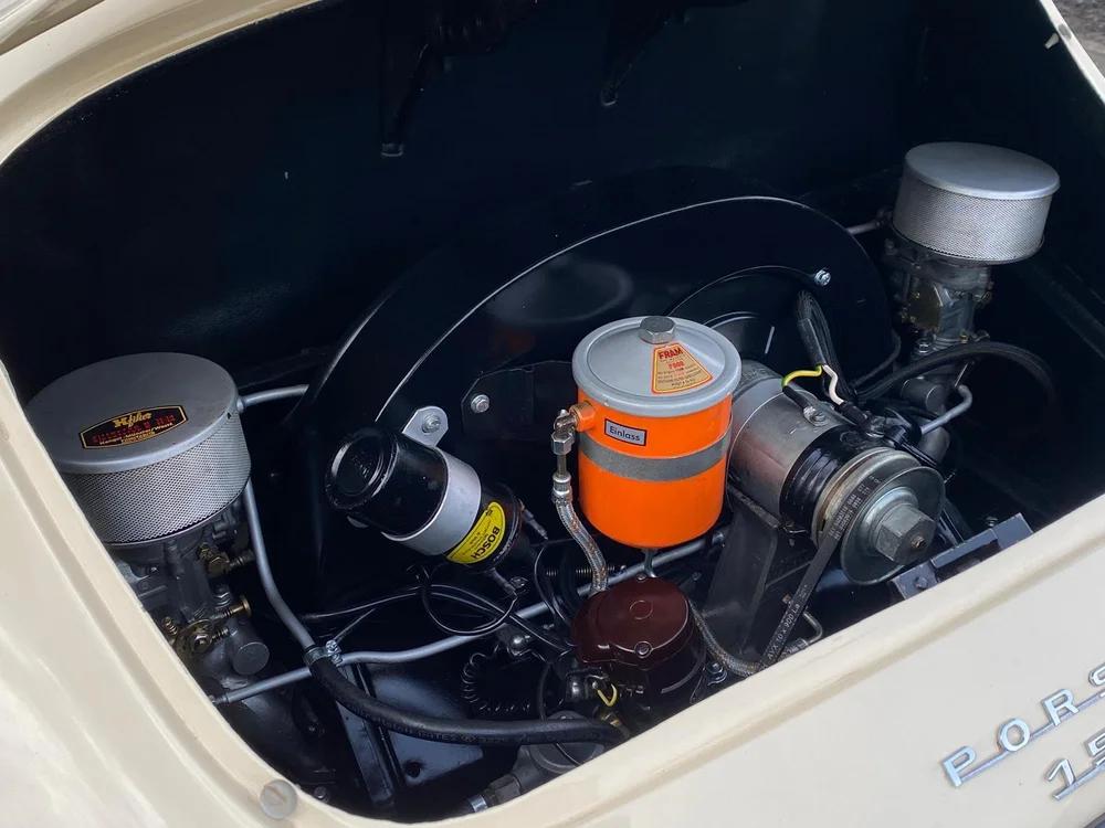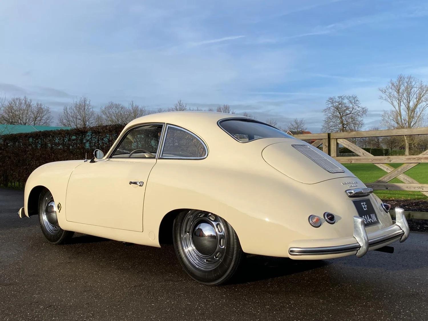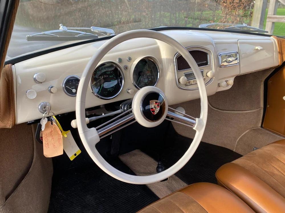 Beautiful Porsche 356 Pre A Knickscheibe coupé from 1954. This car has been ordered by the famous Porsche dealer Hoffman in New York. It was ordered as a standard coupé in black with a green leather interior with as only options: a sleeper seat and a pair of Bosch driving lights. The customer who it was ordered for was a Mr Plummer. Maybe Christopher plummer? The famous actor and Porsche enthousiast? At some point in the past the car has returned to Europe where it has been totaly restored and received this very elegant beige colour with a brown leather interior combination. The full body was restored before being painted and is still in outstanding condition. Mecanically the car has received a period correct 1500cc flat four engine, but not matching any more. Any records on why this car swapped engine is unfortunately unknown. The engine is completely rebuild aswell as the gearbox and runs as new. All other mecanical components also received a rejuvenation cure. Also all was kept as original as possible. Still in 6V configuration! The brown leather interior is in really good condition as is all the rest of the interior. The dashboard has its VDO gauges who are all rebuild and working well. You will notice the Telefunken radio is still in it's place. The front luggage compartment houses a chrome spare wheel and a new Optima 6V battery who is connected to a battery kill-switch underneath the dashboard. On the outside of the car you will find 2 Marchal driving lights, a Nurburgring badge and Reutter logo. A engine hood luggage rack comes with the car but is not fitted at this time. All the new chroom wheels have been wrapped with new period looking tyres in size 5.00-16. If you are looking for the ancestor of all Porsche's, than this is the real deal.