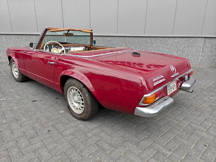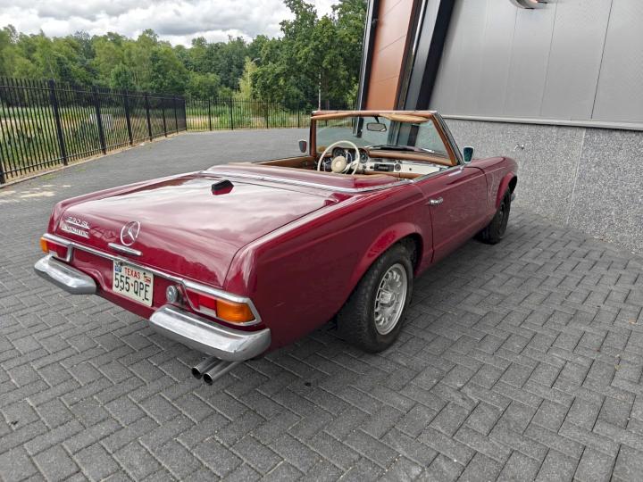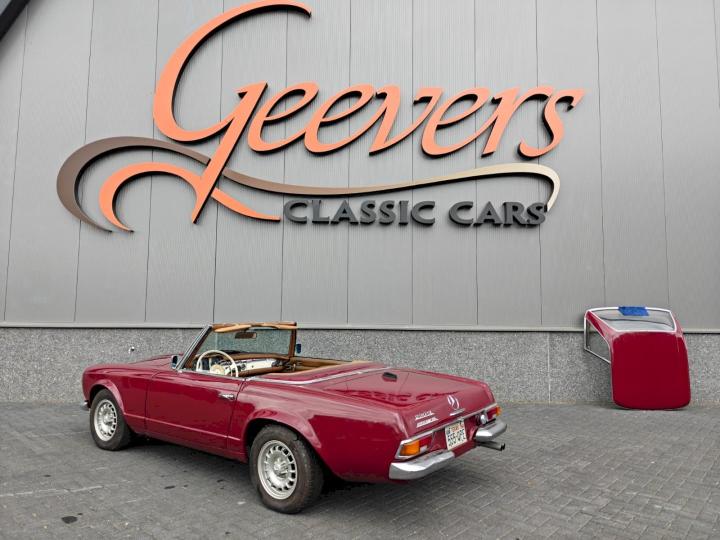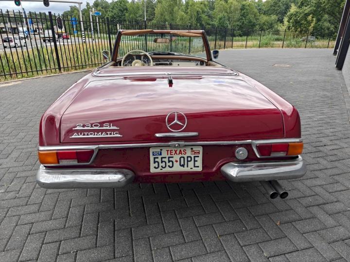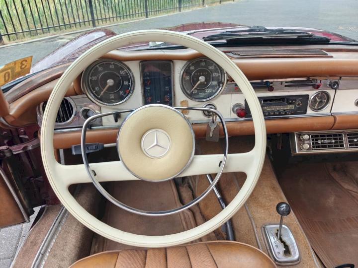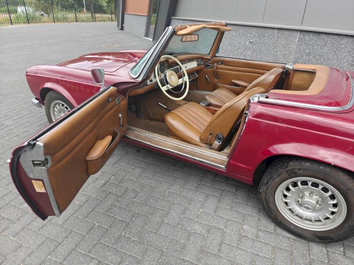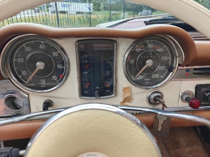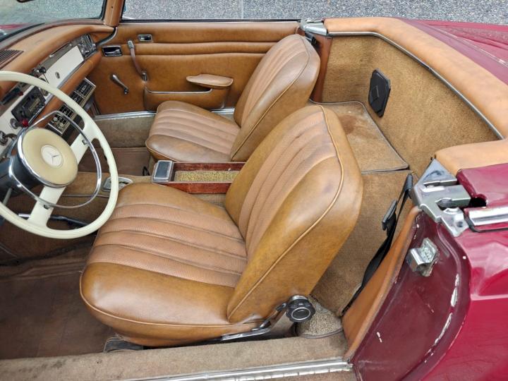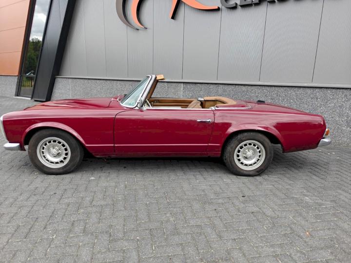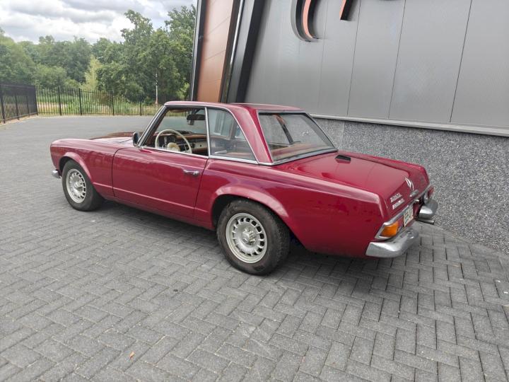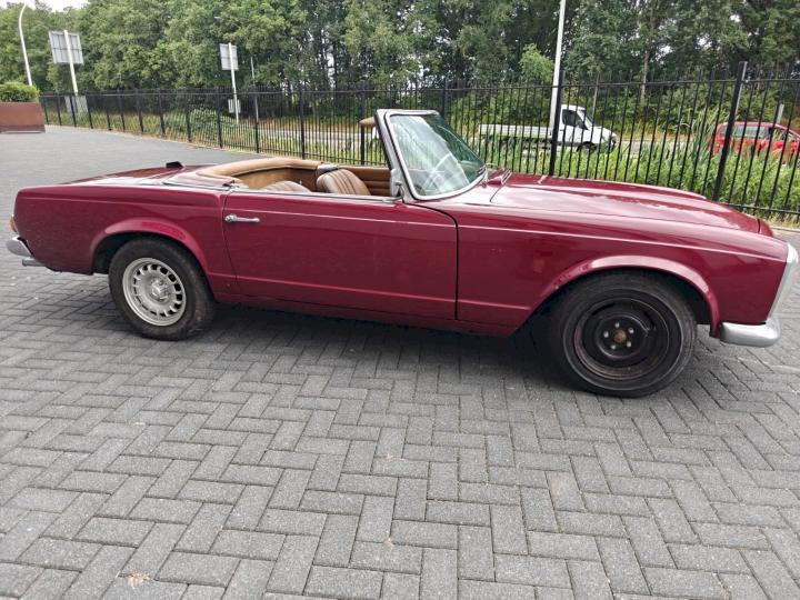 This is an Matching Number 230SL Pagoda with Automatic transmission and 2 Tops, Hardtop and Soft-top, first impression, not an bad example, in the past the previous owner removed the lower side mouldings would be nicer when the are installed again, the car was sitting in storage for a long time and the Matching Number engine has to be awake.