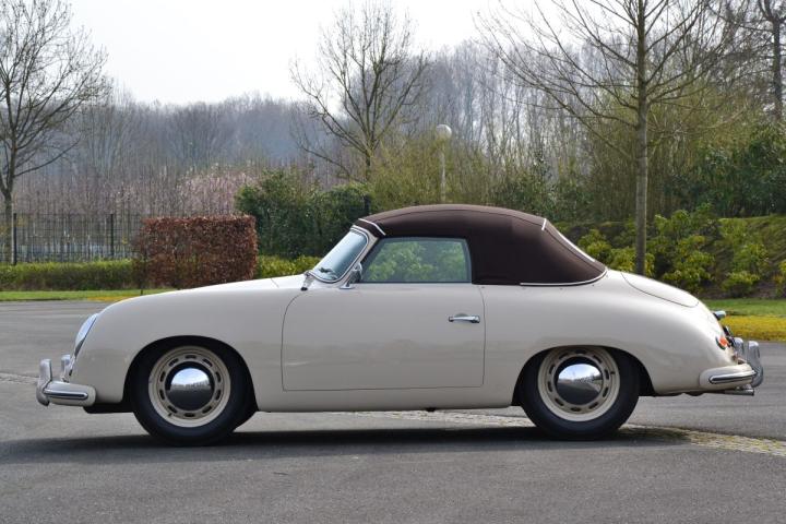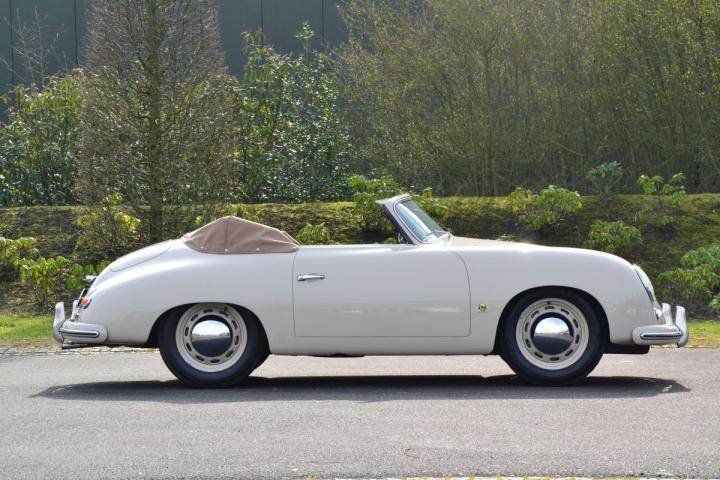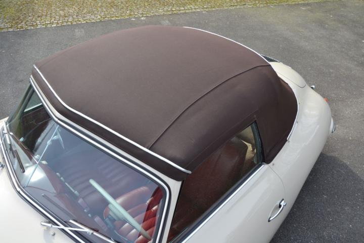Zeldzame pre-A Knickscheibe van Porsche, een van de slechts circa 1.300 gefabriceerde cabriolets, prachtig gerestaureerd en in een bijzondere en originele kleurencombinatie. Het Sandgrau met het rode lederen interieur en de lichtbruine kap geven de auto een mooie jarenvijftiguitstraling. Dit is een van de laatste Knickscheibe cabriolets zonder de claxonroostertjes, wat deze Porsche krachtig in zijn eenvoud maakt en daardoor erg begeerd.