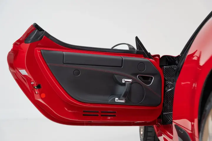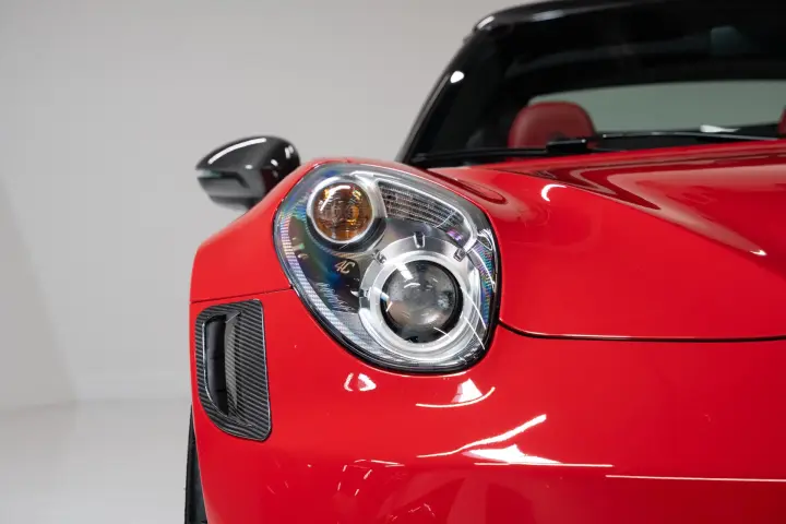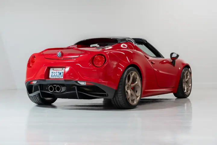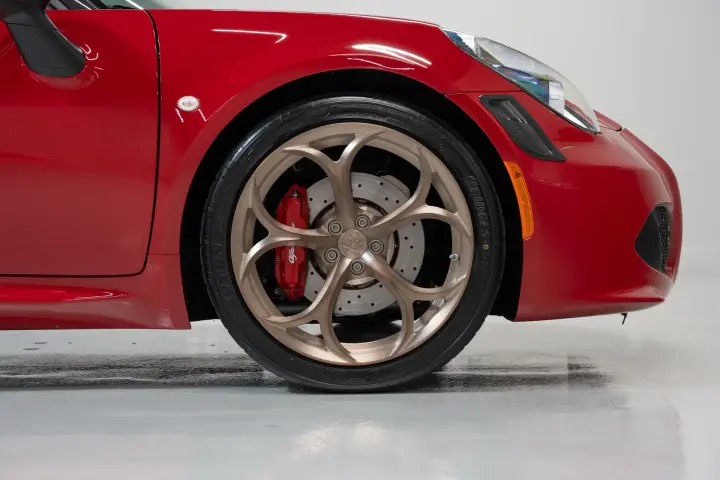 This 2018 Alfa Romeo 4C Spider is finished in Alfa Rosso over Red leather and shows just 3,473 miles from new. Originally delivered in Ohio, it is now California-titled and accompanied by a clean three-owner CARFAX with no accidents or damage reported. This example is exceptionally well optioned, featuring the Carbon Fiber Halo, Akrapovic dual-mode center exhaust, and Spider Track Package 3, which includes a race-tuned suspension and leather/microfiber steering wheel. It also includes bi-xenon headlamps, carbon fiber interior trim (cluster, vents, shift bezel, and dash), carbon fiber Italian flag mirrors, front fascia with carbon fiber vents, red Brembo calipers, and anti-stone film protection. It currently wears a set of bronze Alfa Romeo fan-spoke 18"/19" forged wheels — a factory upgrade inspired by the brand’s racing heritage — and the original silver wheels are included with the sale. In July 2024, the car received a comprehensive service at Trackspec Autosports, including an oil and filter change, new tires, TPMS sensors, and alignment. It remains in excellent mechanical and cosmetic condition throughout, and is offered with both original keys, the OEM Alfa Romeo car cover, battery charger, original window sticker, and complete books and manuals.